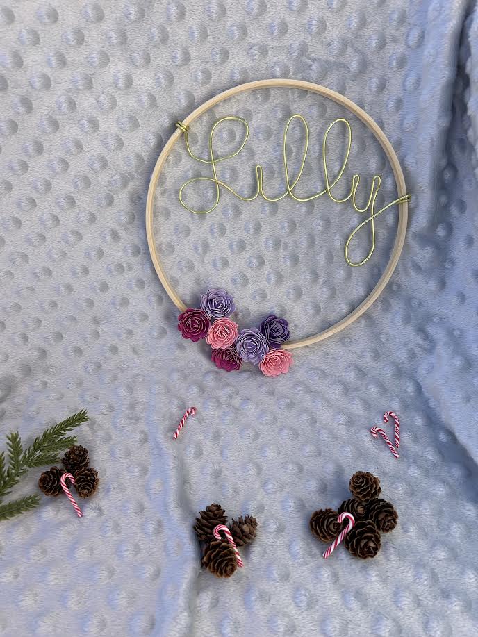 Chaque création est réalisée avec un cercle en bois et un prénom façonné à la main en fil de fer, pour un rendu doux, poétique et unique.