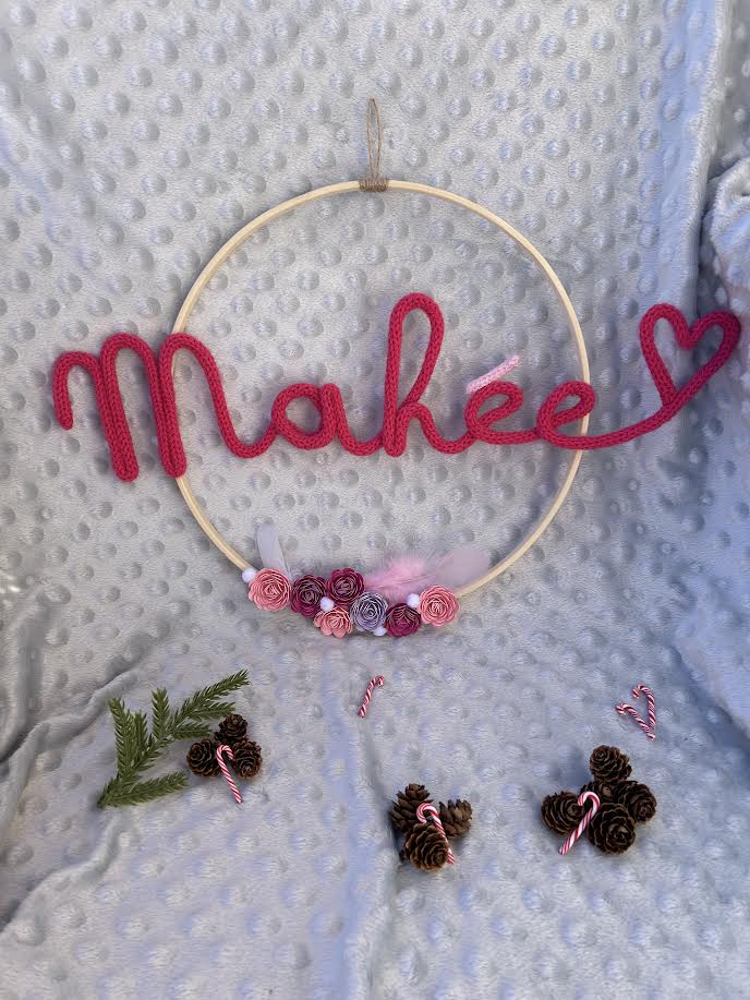 Chaque création est réalisée avec un cercle en bois et un prénom façonné à la main en tricotin , pour un rendu doux, poétique et unique.